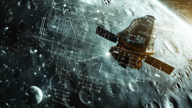 A space shuttle is flying through space with a large number of small dots in the background. The shuttle is surrounded by a network of lines and dots, giving the impression of a complex