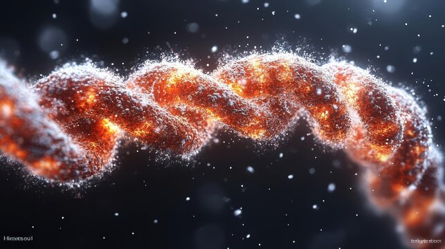 Intricate DNA strand with illuminating particles, symbolizing genetic code and scientific advancements in a dark and glowing scene.