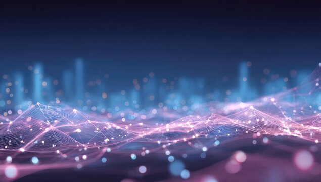 Abstract illustration of a digital network with light nodes over a blurred cityscape