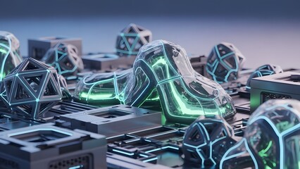 Futuristic abstract technology with glowing geometric and organic forms on a complex circuit board.