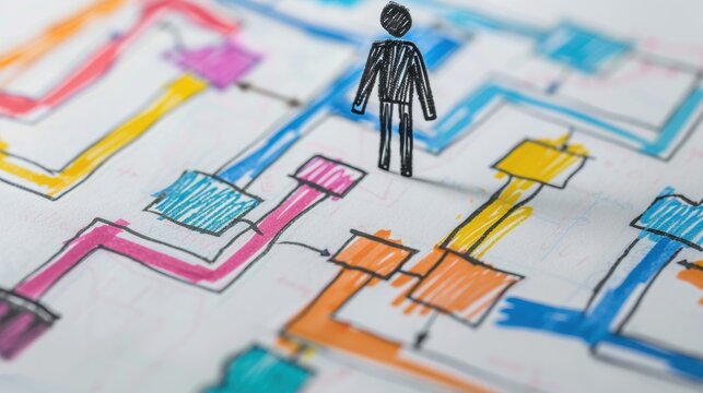 Stick Figure Analyzing a Problem: A stick figure standing by a flowchart, breaking down a complex problem into smaller, manageable parts to identify the most effective solution.