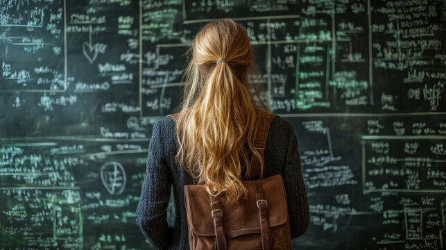 Student Contemplating Complex Equations on a Chalkboard