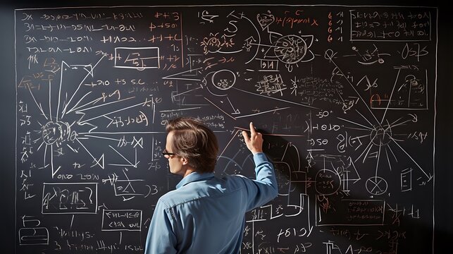 AI generator image of  A person standing in front of a blackboard filled with mathematical or scientific equations and formulas symbolizes contemplation, study, or an attempt to solve a complex proble