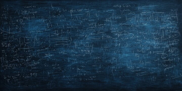 An abstract background featuring a chalkboard with complex mathematical equations written in chalk
