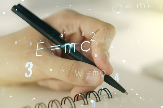 Creative scientific formula hologram with man hand writing in notepad on background, research concept. Multiexposure