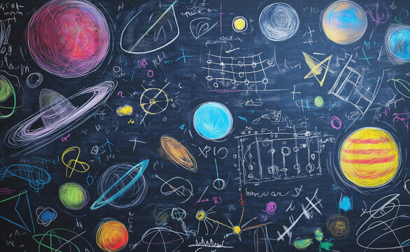 A chalkboard filled with intricate chalk drawings and calculations, including geometric shapes and scientific diagrams, reflecting mathematics and physics concepts.