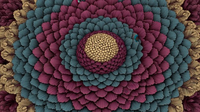 Three Dimensional Fractal Structure with Textured Red Teal and Yellow Concentric Rings Forming a Symmetric Digital Artwork