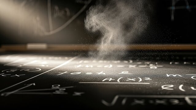 Macro Close-Up of Complex Mathematical Formulas on a Dusty Blackboard