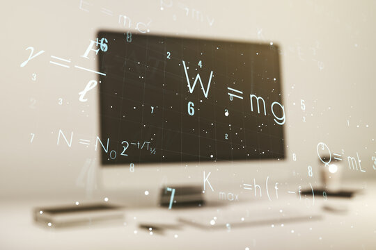 Creative scientific formula hologram on modern laptop background, research concept. Multiexposure