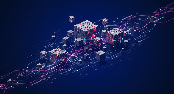 A blue textured sphere at the core of a stylized circuit board with various chips and connections