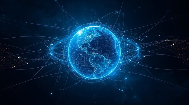 Abstract depiction of a glowing digital globe interconnected by intricate blue lines representing global network and data flow