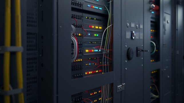 Network Server Close-Up: A detailed view of a network server, with a complex arrangement of cables and lights, showcasing the technological backbone of modern data centers.