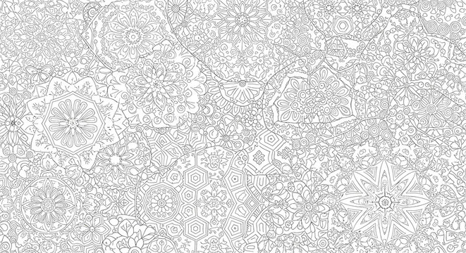 Intricate black and white seamless pattern with detailed mandala and floral geometric elements for coloring or background