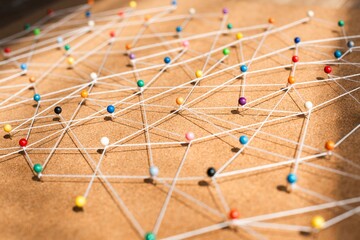 Colorful pins connected by strings on a corkboard background. Network of pins and strings creating a web. Pins and strings forming a complex pattern on corkboard. Business nework background.