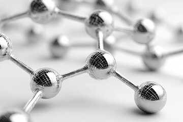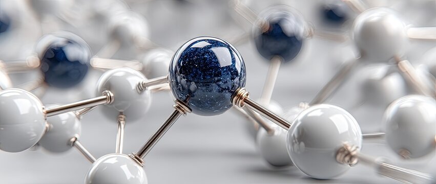 Molecular structure is depicted with connecting spheres and lines against a soft, blurred background, representing scientific or technological concepts.
