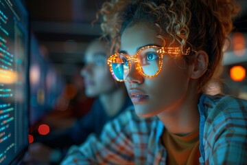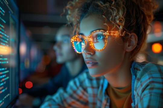 Woman with glasses looks at computer screens filled with code in a dark room at night.