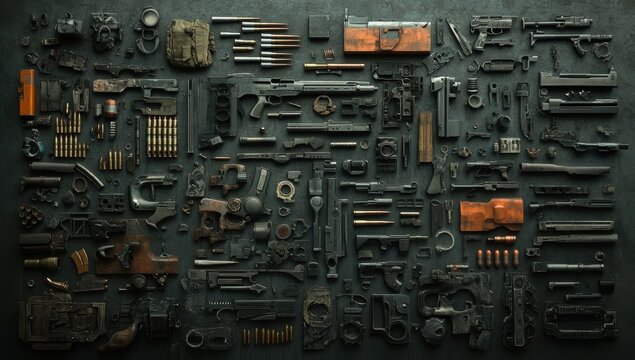 An orderly display of firearm parts and ammunition, set against a dark background, creating a complex and detailed visual array.