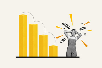 Image picture collage of shocked impressed woman hands touch head omg unexpected result statistics isolated on drawing background