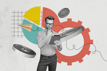 Sketch image artwork composite 3D photo collage of young man stand minded hold tablet coin cogwheel budget finance income savings bank