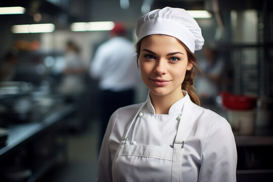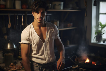AI generated image of smiling male chef standing in a restaurant kitchen