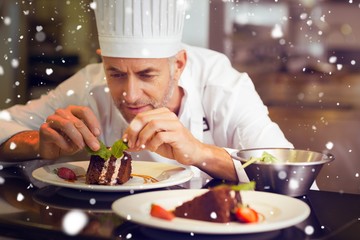 Professional chef garnishing dish with a smile in restaurant kitchen