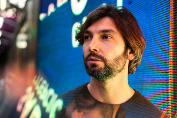 Portrait of man surrounded with digital data