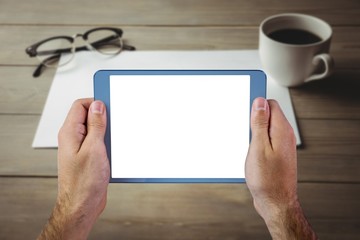 Coffee and tablet with green screen on wooden table