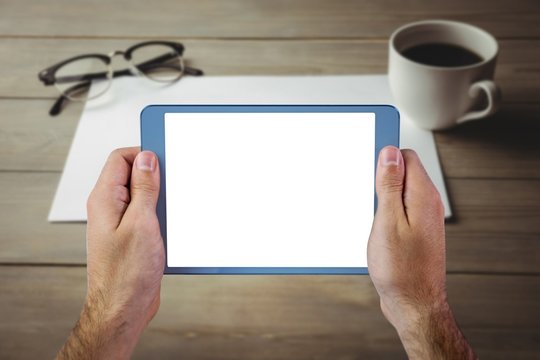Businessman holding tablet with green screen for custom content
