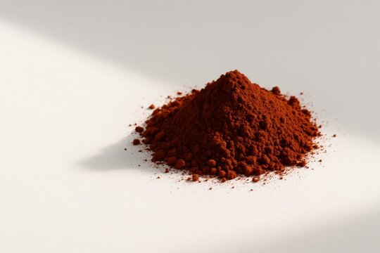 Pile of fine red iron oxide pigment powder on a light neutral surface, captured in soft sunlight highlighting its earthy hue and granular texture in a minimalist composition