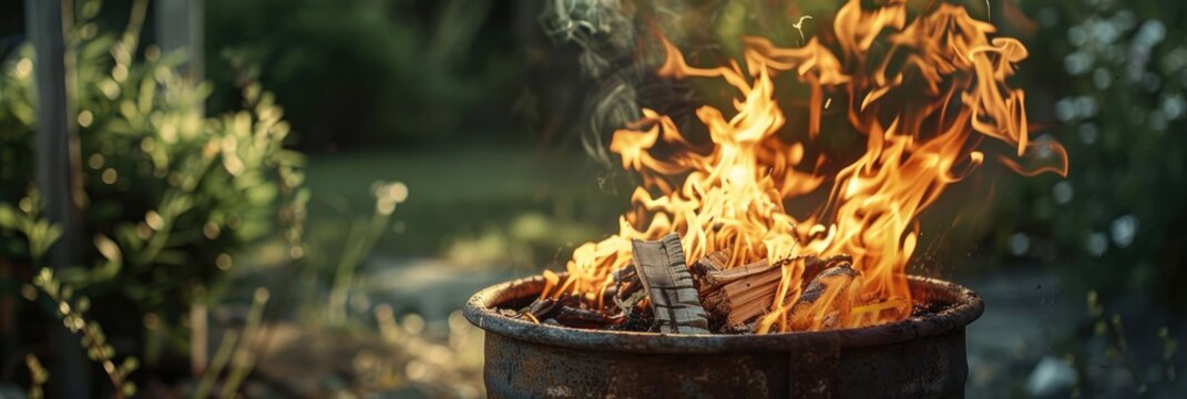 Flames emerging from smoldering garden debris in a rusty metal barrel