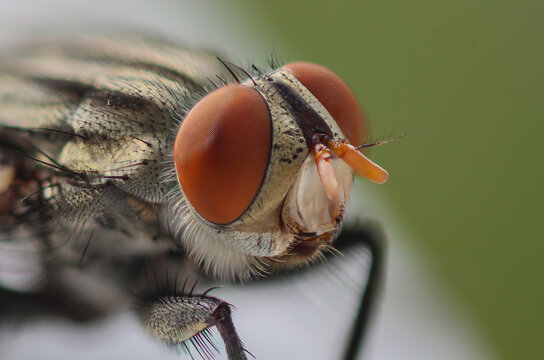 Macro portrait of fly diptera close up with bkack background. Macro sharp and detailed fly compound eye surface.