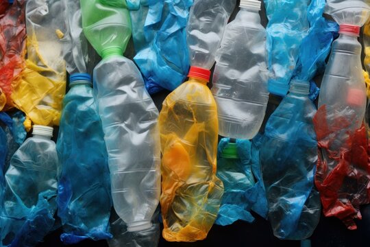 Assorted multicolored compressed plastic bottles prepared for recycling
