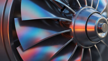 Close-up abstract view of a complex turbine engine rotor with iridescent metallic blades reflecting vibrant colors, showcasing advanced engineering and industrial machinery