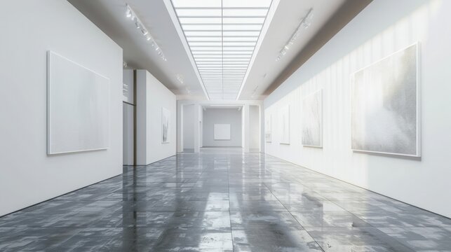 Futuristic virtual art gallery with digital screens and glowing spheres