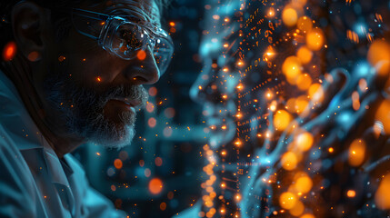 An intrigued scientist closely observes a complex genetic data visualization, representing the cutting-edge of genomics research and analysis