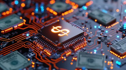 Futuristic circuit board featuring glowing microchip with dollar symbol and scattered banknotes highlighting technology and finance