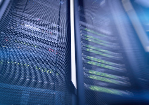 Modern supercomputers in computational data center. Server room. Web internet and network telecommunication technology, big data storage and cloud computing computer service business concept.