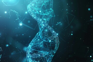 A 3D-rendered DNA strand displays vibrant colors while digital data streams and binary codes flow through a high-tech environment. Generative AI