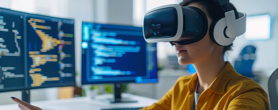 Asian and Indian developer program coding sent to virtual reality headset to implement ai project at office
