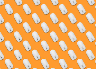 Many white computer mouses on orange background, flat lay. Seamless pattern design