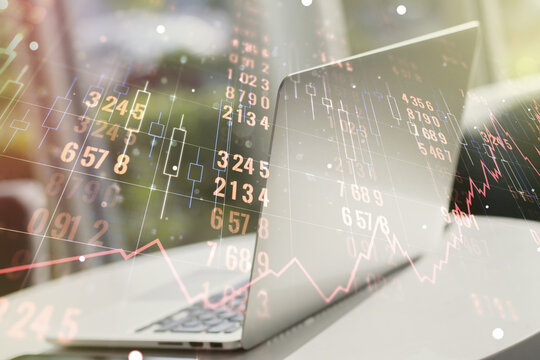 Double exposure of abstract creative statistics data hologram on computer background, analytics and forecasting concept