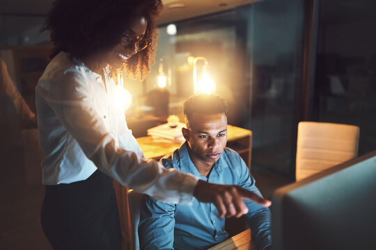 Discussion, computer and business people at night in office for project research, planning and website. Corporate, professional and man and woman on pc for teamwork, collaboration and proposal report