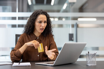 A businesswoman sitting at a desk, expressing frustration holding a credit card and using laptop. The image conveys concepts of online challenges, ecommerce issues, or digital financial difficulties.
