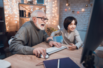 Grandfather and grandson are playing games on computer at night at home.