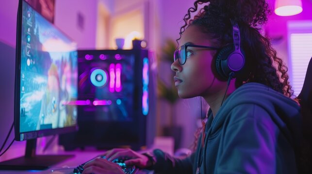 Esports, online RPG, and virtual competition at home with a girl and headgear. Female computer streamer gaming with headphones amid neon lights, live streaming equipment, and Gen Z.