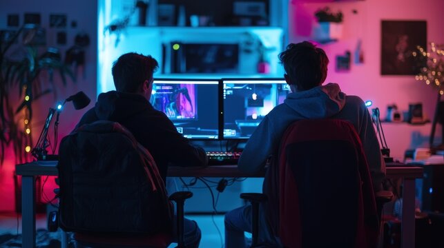 Young men immersed in competitive online gaming in dark room