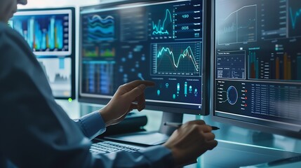An analyst uses a computer and dashboard for data business analysis and Data Management System with KPI and metrics connected to the database for technology finance, operations