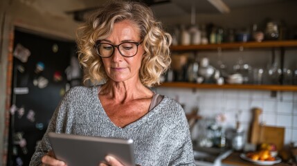 Happy middle aged 50 years old woman using digital tablet sitting in kitchen at home. Mature older lady wearing glasses holding pad computer reading e book, shopping online, making video call., no lo
