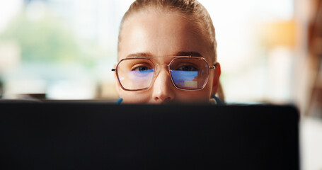 Creative, artist and woman with laptop, office or brand identity on website, glasses or inspiration. Reflection, graphic designer and person with tech for digital art, eyewear and logo design on app