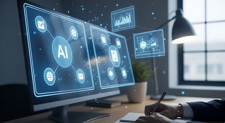 A person working at a desk with computer screens displaying AI and data visualizations.